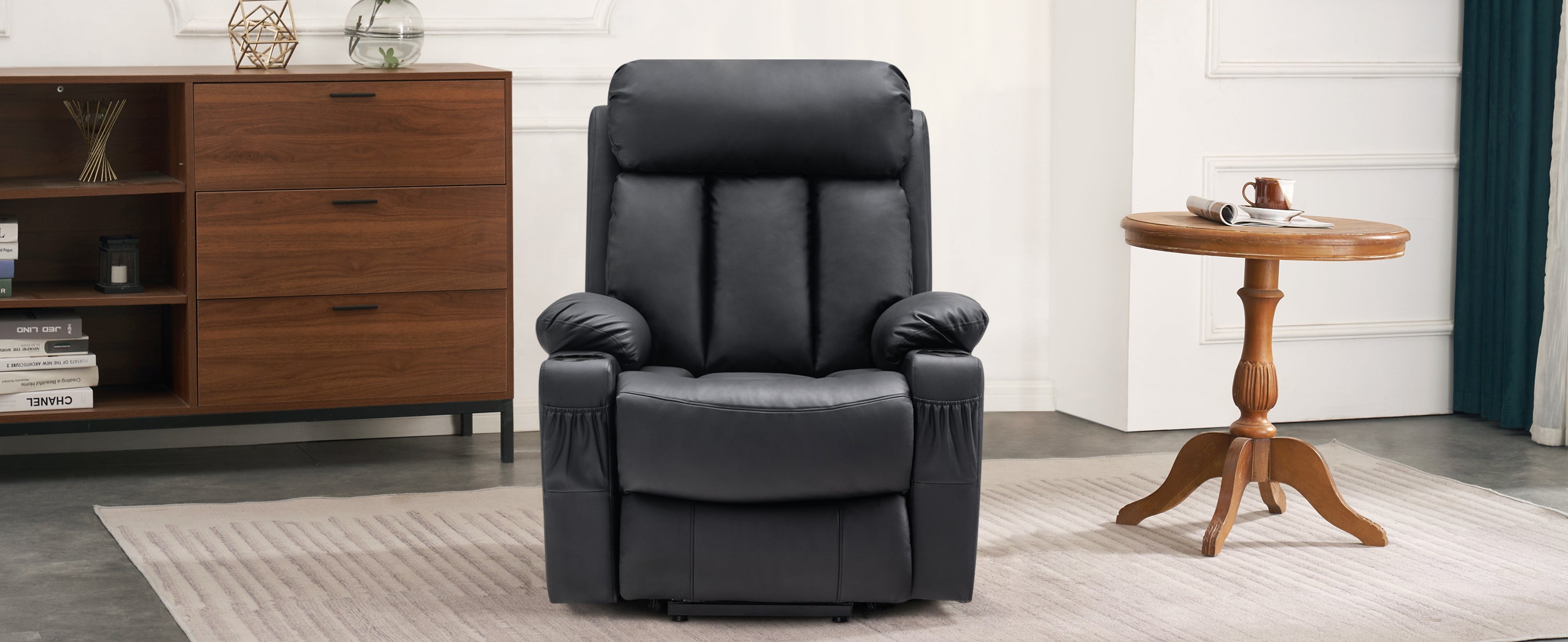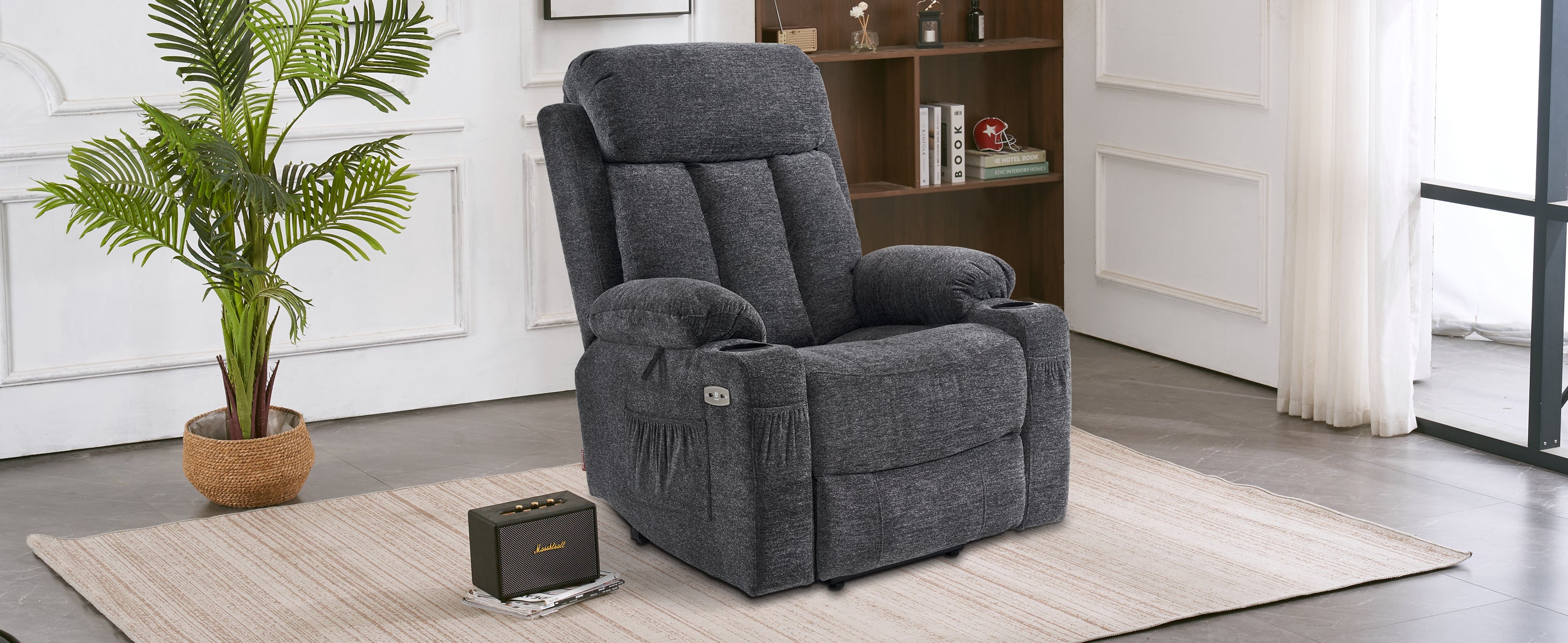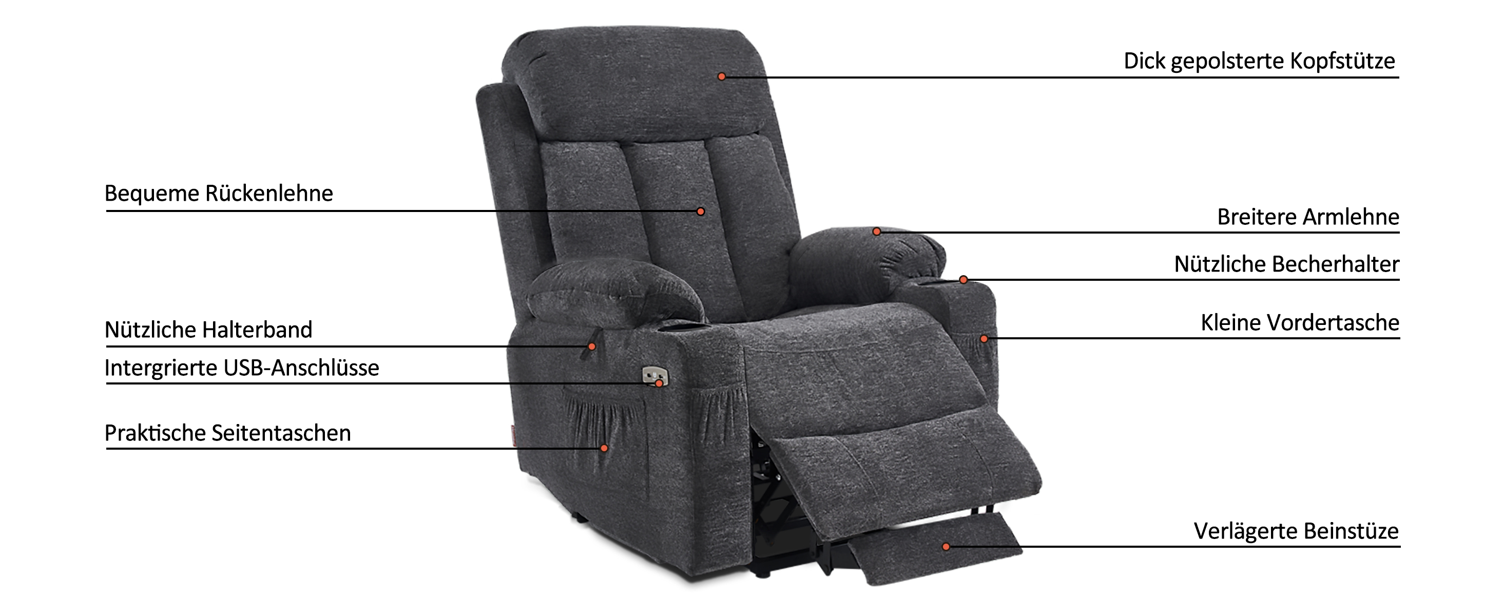 - Multifunktionelle Zubehöre: Multifunktionale Getränkehalter in beiden Armlehnen --Haltebänder unter beiden Armlehne --4 Seitentaschen-, zwei an jeder Seite. So sind die Fernbedingung, Lesebrille und Smartphone praktisch griffbereit.