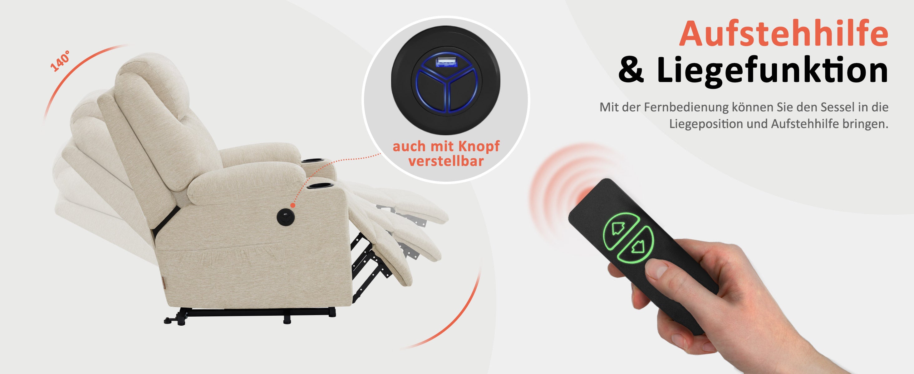 Der elektrische Fernsehsessel mit Aufstehhilfe ist speziell für die Leute, die Schwierigkeiten beim Aufstehen haben. Mit einem kräftigen Elektromotor, ist der Sessel höhenverstellbar und er kann sich gleichzeitig nach vorne neigen. So können Sie ohne Mühe aufstehen. Und umgekehrt können Sie sich langsam und bequem hinsitzen. Bein und Rücken können sich entlastet werden. Es ist ideal für ältere Leute oder Menschen mit Verletzung im Beine- oder Rückenbereich.