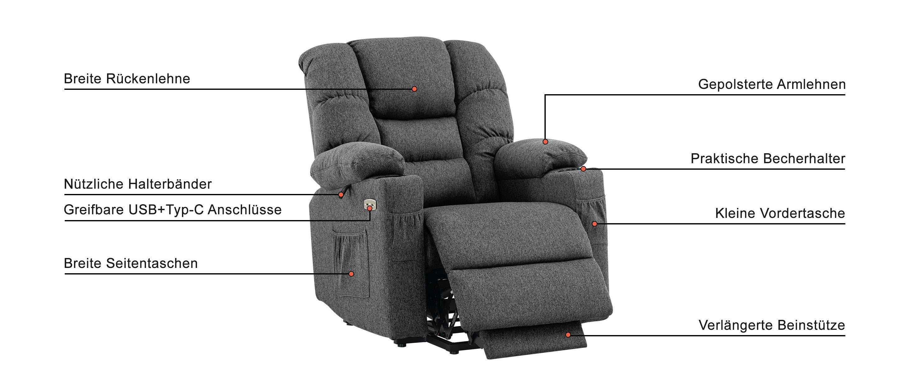 Multifunktionelle Zubehöre: Multifunktionale Getränkehalter in beiden Armlehnen -- Haltebänder unter beiden Armlehne -- 4 Seitentaschen-, zwei an jeder Seite. So sind die Fernbedingung, Lesebrille und Smartphone praktisch griffbereit. Der USB-Anschluss helfen Ihnen beim Aufladen während der Entspannung. (Achtung: Die USB-Anschlüsse sind NUR für Geräte mit geringem Stromverbrauch, wie z.B. iPhone, iPad, vorgesehen.)